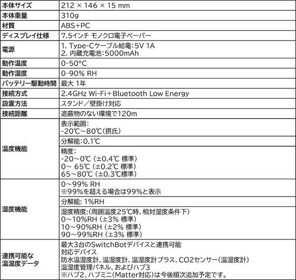 加えて、最大3台のSwitchBot温湿度計シリーズやハブ製品(別売)と連携でき、寝室やベランダ、子ども部屋など、離れた場所の環境も同時に確認可能とのこと。温湿度計・ハブ製品との連携機能は4月末のアップデートにて実装予定で、連携可能な温湿度計との通信距離は最大120m(見通しの良い場所)だという。