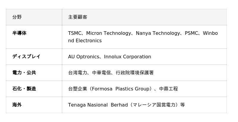 主要顧客 : TSMC、台湾電力、台塑企業、Micron、AU Optronics、Innolux、中華電信 等