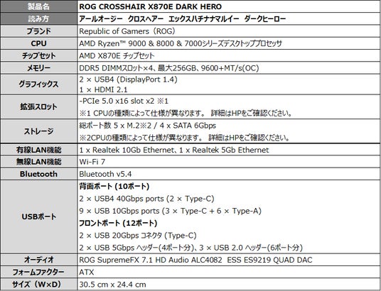 ASUS JAPAN株式会社は、ゲーミングブランドRepublic of Gamersより、AIO Qコネクタを搭載したAMD AM5 ソケットX870Eチップセットのマザーボード「ROG CROSSHAIR X870E DARK HERO」、ホワイト基板のTUF Gamingマザーボード「TUF GAMING X870-PRO WIFI7 W NEO」、B650チップセットのMicroATXマザーボード「TUF GAMING B650EM-E WIFI」の3モデルを発表しました。2026年4月24日(金)より販売開始します。