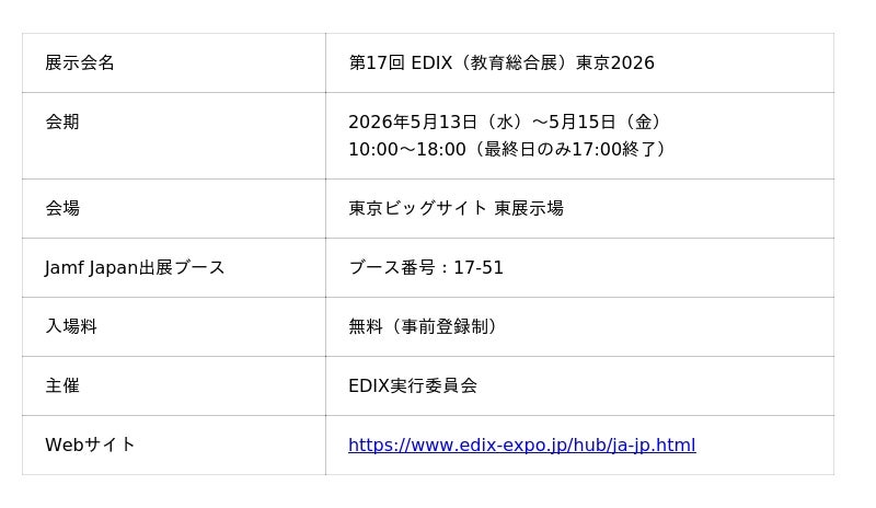 企業・組織におけるAppleデバイスの管理とセキュアな運用のための業界標準ソフトウェアを提供する Jamf Japan(本社:東京都千代田区、カントリーマネージャー:岡 学)は、2026年5月13日(水)から15日(金)まで東京ビッグサイトで開催される「第17回EDIX(教育総合展)東京2026」に出展いたします。
