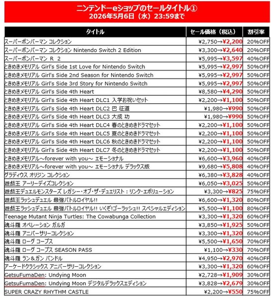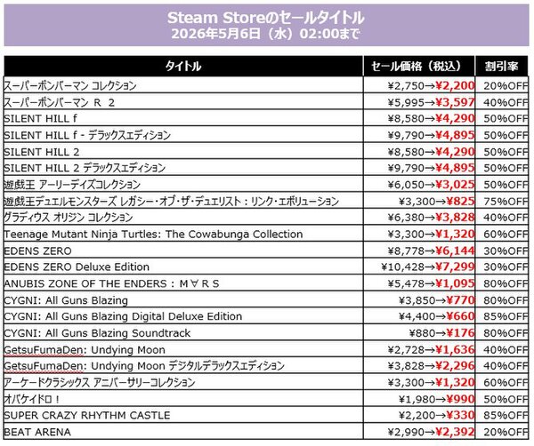 コナミデジタルエンタテインメント(以下、KONAMI)は4月23日、ニンテンドーeショップ/PlayStation Store/Steam Storeにおいて、ダウンロード版ゲームを最大85%オフでお得に購入できるKONAMI「GOLDEN WEEK SALE」を開催中だと発表。セール期間は各デジタルストアで異なるので、下記をチェックしてほしい。