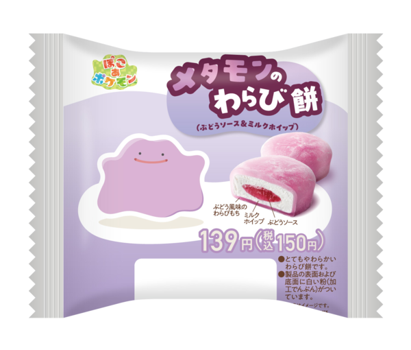 メタモンをイメージしたぶどう風味のやわらかいわらび餅。 商品は本当にメタモン色をしています。