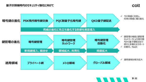 商用サービスとして耐量子ネットワークを提供するには、暗号鍵の進化(PSK→PQC→QKD)だけでなく、「鍵管理の進化」「適用領域の拡大」も欠かせない。そこでColtでは、これら3つの側面から技術開発を進めているという。