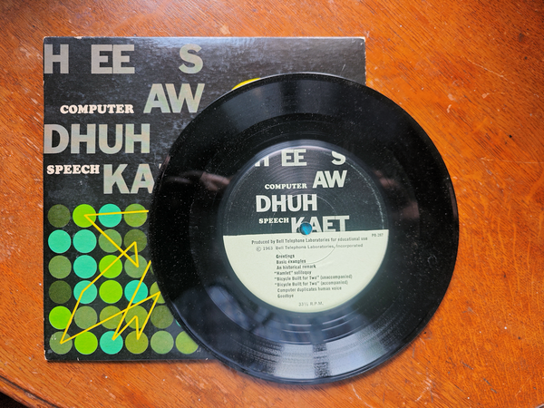 ベル研の合成音声のデモンストレーションを収録した7インチ33RPMのレコード。パンチカードで指示して、音声ピッチ、音量、唇の開き具合などの9つの制御信号をコンピュータが連続的に生成して合成音声を生成したそうだ。