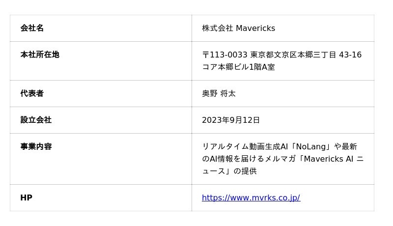 株式会社Mavericksは、プロダクトアウト型の生成AIスタートアップです。リアルタイム動画生成AI「NoLang」や超解像化技術「カクダイ」など、先端的な自社プロダクトを多数保有しています。生成AI時代の開発現場の先端をキャッチアップしている、開発力に特化したチームです。