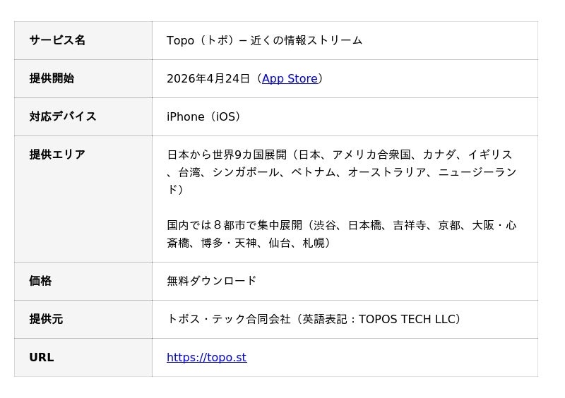 トポス・テック合同会社(本社:東京都中央区、代表:今井健史)は、2026年4月24日、半径500mの“今”が分かる街の投稿アプリ「Topo(トポ)」をApp Storeでリリースしました。「SNS疲れ」という現代の課題に応えるため、投稿は3日間で消え、最新のオンデバイスAI「Apple Intelligence」による簡単な投稿体験が可能であり、プライバシー保護にも十分配慮しています。これにより、ユーザー様は街とのつながりを強化し、新しい体験をお楽しみいただけます。