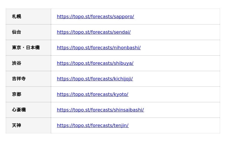 こうした街の変化はTopoの中で日々蓄積され、解析されています。アプリケーションの枠を超えた新しい地域メディア事業として、街と人をつなぐコンテンツ体験を提供します。各都市の予報はWebでも無料で閲覧可能です。