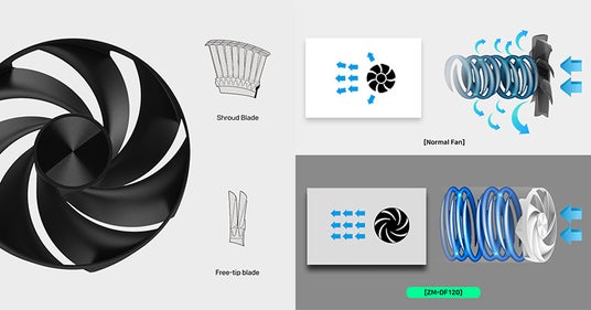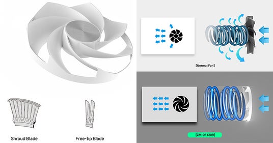 ブレードの先端をリング状につないだシュラウドリングブレードを採用しています。通常は横に逃げてしまう風を目的の方向に進ませることで、効率的な冷却を実現。ブレード先端付近の乱流や逆流を防ぐことで不要な振動を抑え、安定性を高めています。