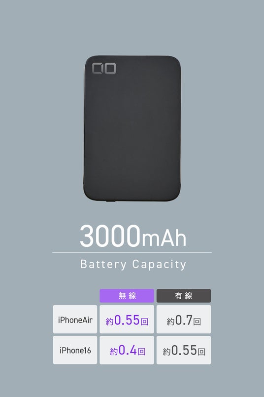 ■必要な分だけ持ち歩く3000mAhという容量容量は3000mAh。大容量で重くなる方向ではなく、「ちょっと足りない(不安な)時がある」を軽く解決するためのちょうどいい容量です。ワイヤレス充電では iPhone16を約0.4回、iPhone15を約0.5回、iPhone Airなら約0.55回の目安。外出先での“あと少し足りない”をしっかり補い、かさばらずに持ち運べるモバイルバッテリーです。
