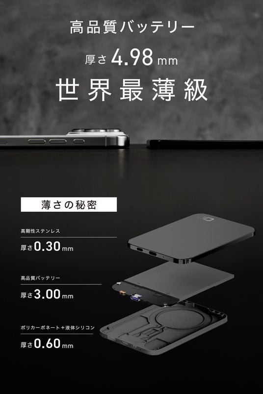 ■薄さにこだわり抜いた設計厚さ4.98mm・重さ約82gのミニマル設計。 iPhoneの背面に装着しても出っ張らない、かさばらない。持ち歩いていることを忘れるほどの世界最薄クラスのモバイルバッテリーです。