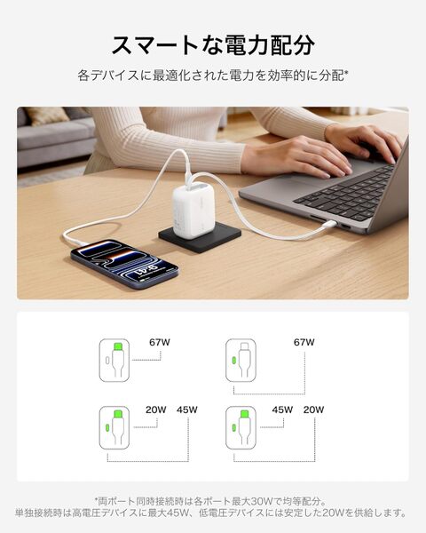 さらに本体にはUSB-Cポートももう1つ用意されているため、2台同時充電にも対応。出力は状況に応じて自動で振り分けられ、ノートPC+スマホといったフル装備にも対応できます。「充電器1個で全部やりたい」という願望も、これなら普通に叶います。
