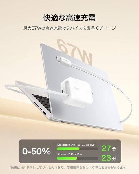 見た目はコンパクトでも、中身はなかなかのパワー系。最大67WのUSB-C PDに対応しており、スマホはもちろん、MacBookクラスのノートPCも高速充電できます。