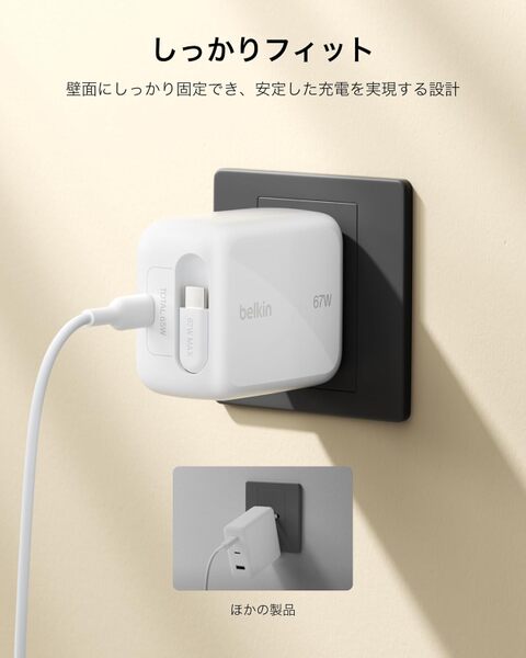 地味なポイントではありますが、充電時に抜け落ちや接続切れを防ぎやすい設計なんだそう。壁コンセントに挿したときの安定性は、意外に使い勝手を左右する部分ですからね。