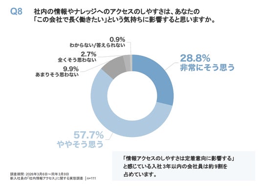さらに、「社内の情報やナレッジへのアクセスのしやすさは、『この会社で長く働きたい』という気持ちに影響すると思いますか」という質問には、「非常にそう思う」(28.8%)、「ややそう思う」(57.7%)をあわせ、86.5%が定着意向に影響すると回答しています。