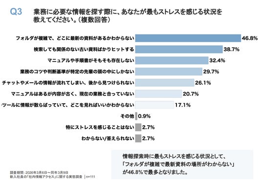 - 新入社員の85.6%が「社内情報の所在がわからず手が止まった経験」あり