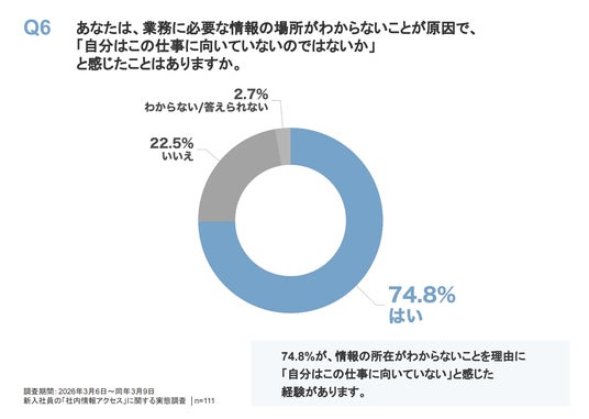 「業務に必要な情報の場所がわからないことが原因で、『自分はこの仕事に向いていないのではないか』と感じたことはありますか」という質問に対し、74.8%が「はい」と回答しました。