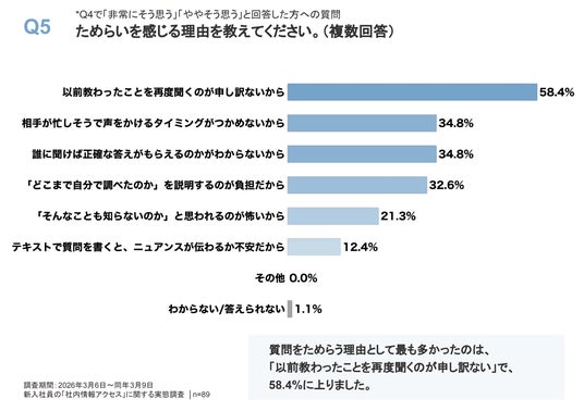 先輩や上司に業務上の質問をすることに心理的なためらいを感じるかという質問には、「非常にそう思う」(28.8%)、「ややそう思う」(51.4%)と、合計80.2%がためらいを感じていることが判明しました。ためらいを感じる理由の最多は、「以前教わったことを再度聞くのが申し訳ないから」で58.4%に達しています。この心理状況は、現場の教育体制において「人に聞かずとも自力で再確認できる仕組み」がいかに重要かを再認識させるデータとなります。