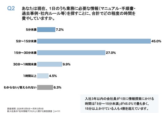 また、1日のうち業務に必要な情報を探すことに費やす時間は、「5分~15分未満」が45.0%で最多でしたが、「15分~30分未満」(27.0%)、「30分~1時間未満」(9.9%)、「1時間以上」(4.5%)と、15分以上を情報探索に費やす層が合計41.4%に上りました。これは、情報アクセスの悪さが単なる手間の問題ではなく、企業全体で見れば無視できない業務時間の損失(コスト)につながっていることを示しています。