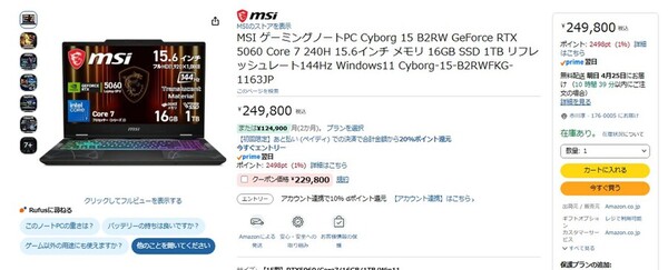 Amazon.co.jpにて、MSIの15.6型ゲーミングノートPC「Cyborg 15 B2RW」が販売中だ。価格は24万9800円だが、クーポンを適用すると22万9800円で購入できる(4月24日時点)。