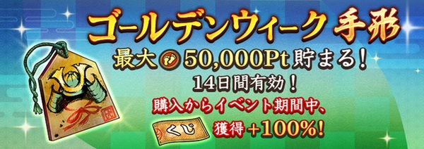 交換用アイテム「ゴールデンウィークくじ券」を集めるキャンペーン。開催期間中、フィールドの民タップ時(農民・豪農・商人・豪商・野盗・早馬)や合戦勝利時に「ゴールデンウィークくじ券」を獲得できる。