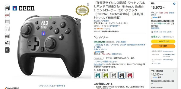 Amazon.co.jpにて、ホリの「【任天堂ライセンス商品】ワイヤレスホリパッド TURBO for Nintendo Switch 2 コントローラー ミストブラック」が販売中だ。価格は6973円。