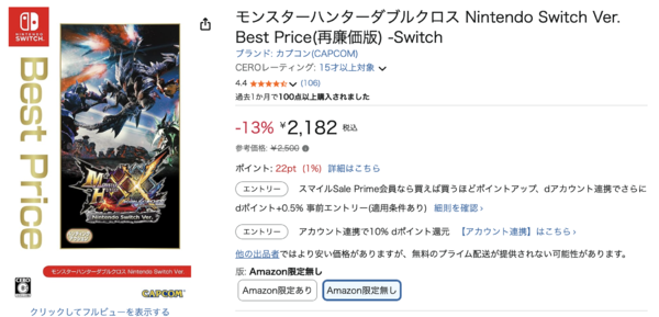 今回は「モンスターハンター」の話です。最新作「モンスターハンターワイルズ」の没入感に浸り、「ライズ:サンブレイク」の爆速アクションで指の筋肉が悲鳴をあげた……そんな現代のハンターである我々ですが、今回紹介するのは、「モンスターハンターダブルクロス Nintendo Switch Ver. Best Price」。Amazonでは参考価格が2,500円のところ、13%オフの2,182円で販売中です(4月24日現在)。