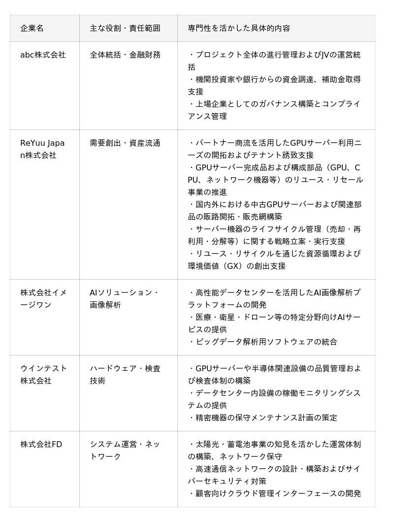 abc株式会社(本社:東京都港区、代表取締役:松田 元、証券コード:8783、以下「当社」)は、ReYuu Japan株式会社(本社:東京都港区、代表取締役:重富 崇史、証券コード:9425)、株式会社イメージワン(本社:東京都品川区政司表取締役:川倉 歩、証券コード:2667)、ウインテスト株式会社(本社:神奈川県横浜市、代表取締役:姜 輝、証券コード:6721)、および株式会社FD(本社:愛知県刈谷市、代表取締役:鈴木 政司)の4社(以下、総称して「5社」)との間で、日本国内におけるAI特化型高性能データセンター(以下「本データセンター」)の開発および運営体制の構築を目的とした合弁会社「AI Data Partners(仮称)」(以下「本合弁会社」)の設立に向け、2026年4月24日付で基本合意書(MOU)を締結いたしました。