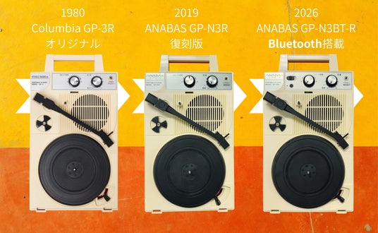 Columbia(日本コロムビア)が生み出した銘機「GP‑3R」は、手軽にレコードを楽しめるポータブルプレーヤーとして長く愛され、多くの家庭で親しまれてきました。近年のレコード文化の再来を受け、その魅力を現代に蘇らせたのがANABASの「GP‑N3R」です。GP‑3Rの機能とデザインをそのままに正式ライセンスで復刻し、当時の使いやすさと温かみを忠実に再現しました。そして最新モデル「GP‑N3BT-R」では、アナログの良さを生かしながらBluetooth機能を搭載し、スピーカーやヘッドホンへワイヤレスで音を届ける新しいレコード体験を実現。半世紀にわたり受け継がれてきたポータブルレコードの系譜が、今の時代に合わせて進化したレコードプレーヤーとなっています。