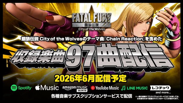 『餓狼伝説 City of the Wolves』の楽曲が、各種サブスクリプションサービスにて配信されることが決定した。 テーマ曲「Chain Reaction」を含む全97曲を収録予定だ。 配信開始は2026年6月を予定。
