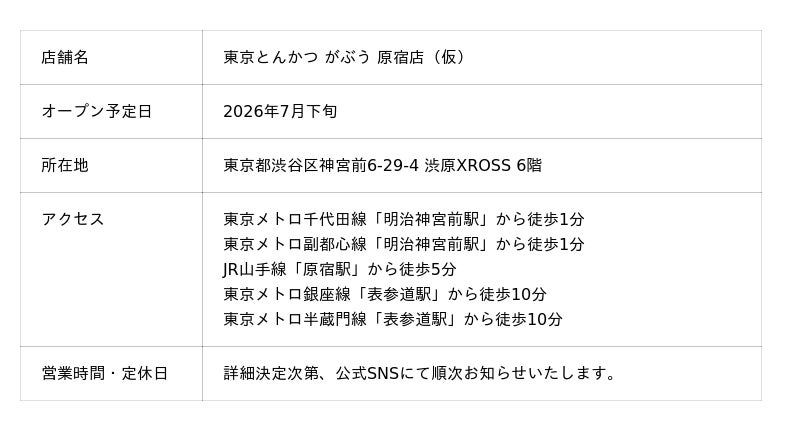 新店舗は、東京メトロ「明治神宮前〈原宿〉」駅から徒歩1分というアクセス至便な立地に誕生する新築ビル「渋原XROSS」の6階にオープンします。洗練された神宮前の街並みを見下ろす空間で、新しいとんかつの形をご提案します。 オープンは2026年7月下旬を予定しております。詳細なメニュー構成や予約開始時期につきましては、後日改めてお知らせいたします。