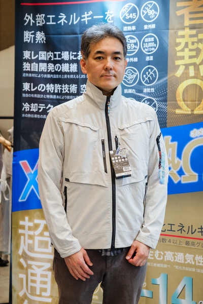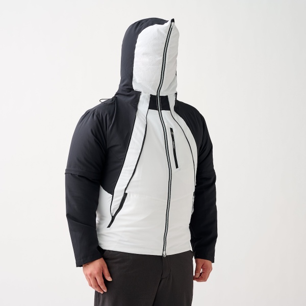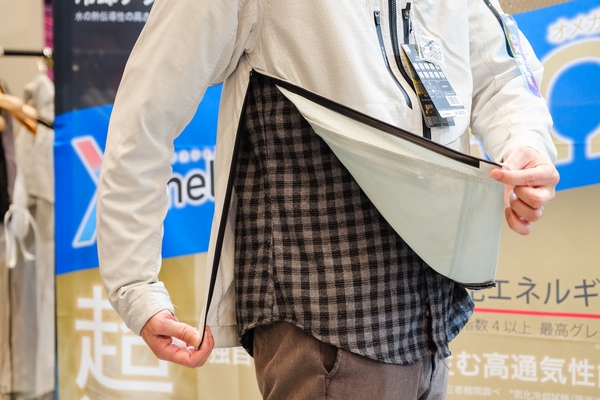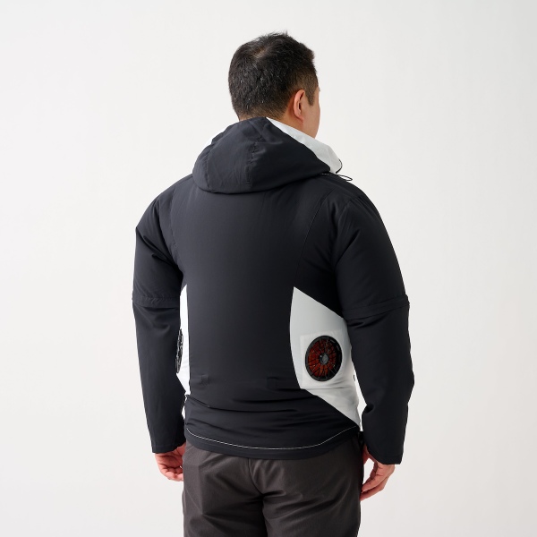 中でも注目しているのが、新製品となる「XShelter暑熱αコンバーチブルファンジャケット」(価格4900円/バッテリー別売)。その名の通り暑熱α素材を使ったもので、フードも装備。不審者スタイルのままファンが使えるというのもユニークです。
