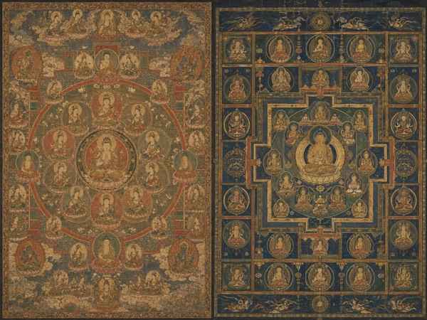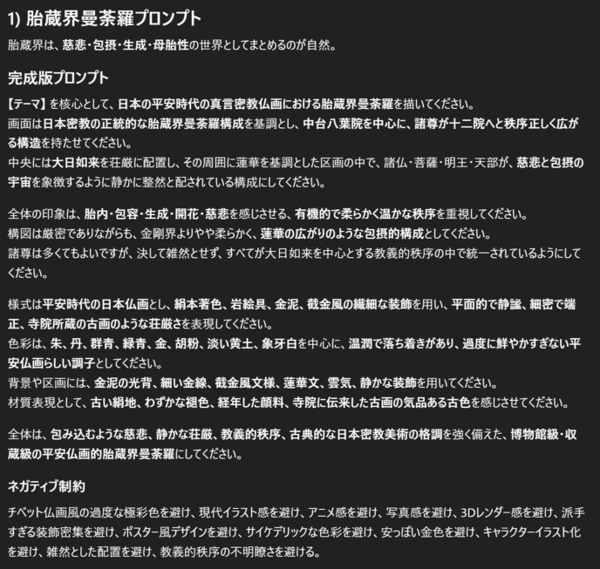 さて、日本では、9世紀初頭の平安時代に確立された真言密教(真言宗)での「両界曼荼羅」が有名で、「胎蔵界曼荼羅」と「金剛界曼荼羅」の2幅で1組とされます。筆者が、日本の仏教の曼荼羅を作ってと指示すると、そのどちらを作ってほしいのかとGPTから質問が飛んできて、構成要素を整理されました。そして、プロンプト案をあらためて作り直してきました。それにより作成された曼荼羅は以下です。