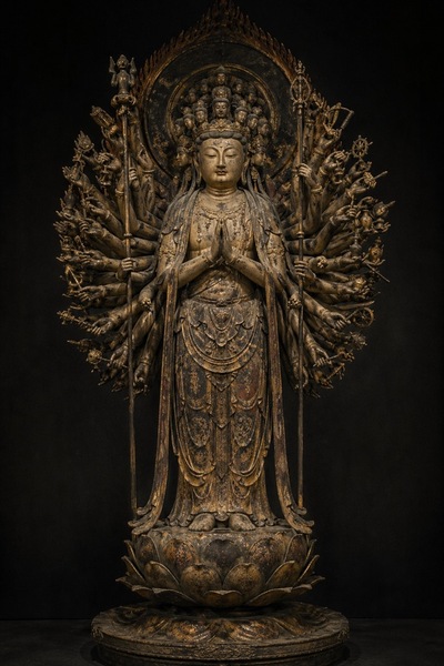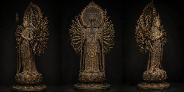 古典的な立像についての理解はどれぐらいあるのかを試すために、同じように、千手観音像のプロンプト案をGPTに作成させた後に生成させてみました。また、非常に複雑な面構成で出てくるものを、横や後ろなどの別角度の場合に再現できるかというのも試してみました。完全な真横は生成できなかったのですが、斜めは生成できました。もっとも、背面を見たことはないので、この妥当性も判断できないというのが正直なところです。
