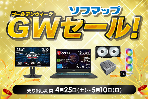 ソフマップ・ドットコムは、4月25日から待望のゴールデンウィークセールを開始した。このセールでは、ゲーミングPCやモニター、PCパーツなどが特別価格で提供されるという。新たにゲーミング環境を整えたい人や、自作PCのアップグレードを考えている人には見逃せない機会となるだろう。