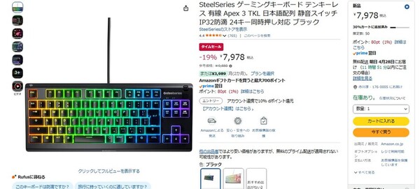 Amazon.co.jpにて、SteelSeriesの有線ゲーミングキーボード「Apex 3 TKL」が販売中だ。参考価格は9880円だが、タイムセールにより19%オフの7978円で購入できる(4月27日時点)。