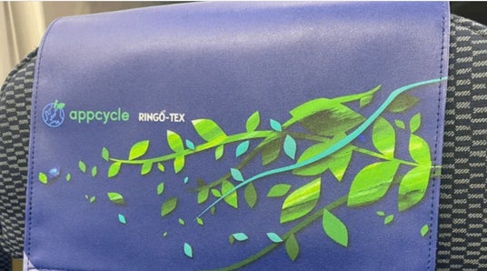 「RINGO-TEX(R)」は、青森県の廃棄りんごや残渣(搾りかすなど)を原料とした環境配慮型の国産合成皮革です。原料の72~74%が廃棄物をアップサイクルしたもので構成されており、従来の合成皮革と比較して石油由来のポリウレタンの使用や、開発・製造、加工、廃棄など各工程でのCO2排出量が少なく、高い強度が特徴です。