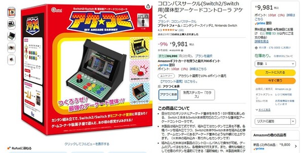 Amazon.co.jpにて、コロンバスサークルの筐体型アーケードコントローラー「アケつく」が販売中だ。参考価格は1万978円だが、執筆時点では9%オフの9981円で購入できる(4月27日時点)。