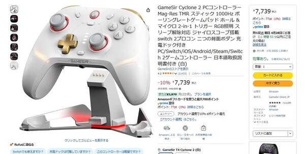 Amazon.co.jpにて、PC・Switch・モバイルに対応するコントローラー「GameSir Cyclone 2」が販売中だ。参考価格は8599円だが、執筆時点では10%オフの7739円で購入できる(4月27日時点)。