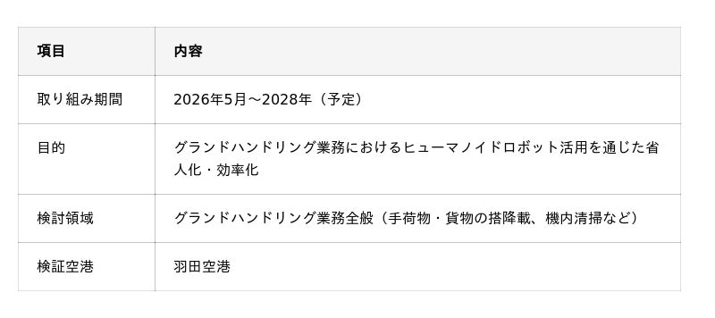 JALグループの国内主要空港のグランドハンドリング業務(航空機の牽引や手荷物・貨物搭降載作業など)を担う株式会社JALグランドサービス(代表取締役社長:鈴木 美輝、以下「JGS」)とGMOインターネットグループにおいてAIとロボティクスの社会実装を推進するGMO AI&ロボティクス商事株式会社(代表取締役社長:内田 朋宏、以下 「GMO AIR」)は、2026年5月より、国内で初めて(※1)空港でのヒューマノイドロボット活用に向けた実証実験を開始いたします。