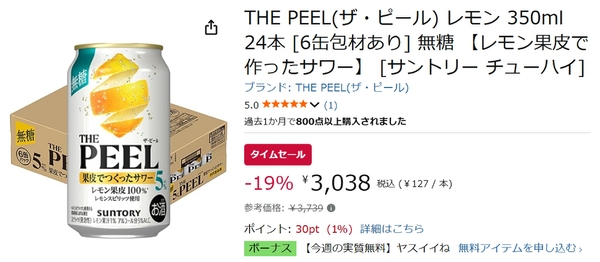 サントリーのチューハイ「THE PEEL(ザ・ピール) レモン 350ml 24本」が、現在Amazonタイムセールに登場しています。
