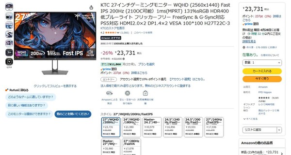 Amazon.co.jpにて、KTCの27型WQHDゲーミングディスプレー「H27T22C-3」が販売中だ。参考価格は3万2000円だが、執筆時点では26%オフの2万3731円で購入できる(4月27日時点)。