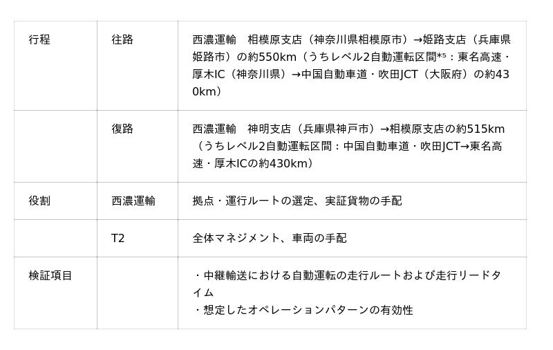 今回、レベル4が実現した際の自動運転トラックの活用の可能性をさらに広げるため、西濃運輸が関東ー九州・中四国の最大1,000km以上の区間内で行っている「中継輸送」(長距離輸送で中継地点を設定し、複数のトラックで貨物を積み替えて運行する輸送形態)のうち、神奈川県ー兵庫県の区間にT2の自動運転トラックを組み込み、西濃運輸の通常のトラックと連携する一連のオペレーションを確認する取り組みを以下のとおり2026年4月20日より開始しました。