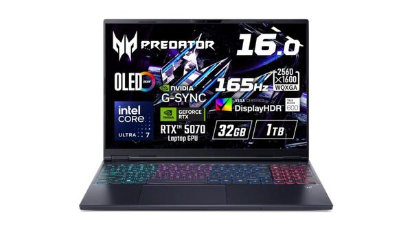 本製品は、インテル「Core Ultra 7 255HX」とNVIDIA「GeForce RTX 5070」を搭載する16型ゲーミングノート。メモリーは32GB(DDR5-6400)、ストレージは1TB SSD、解像度はWQXGA(2560×1600ドット)+OLED、リフレッシュレートは165Hz、OSはWindows 11 Homeなど。