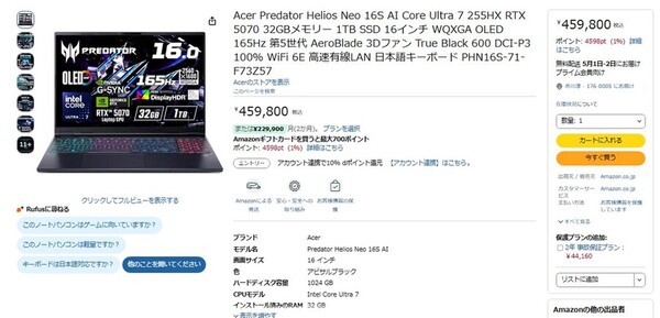 Amazon.co.jpにて、Acerの16型ゲーミングノートPC「Predator Helios Neo 16S AI」が販売中だ。価格は45万9800円。