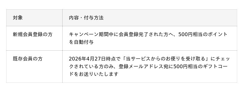キャンペーン1.:新規会員登録&既存会員向け 500円相当ポイントプレゼント