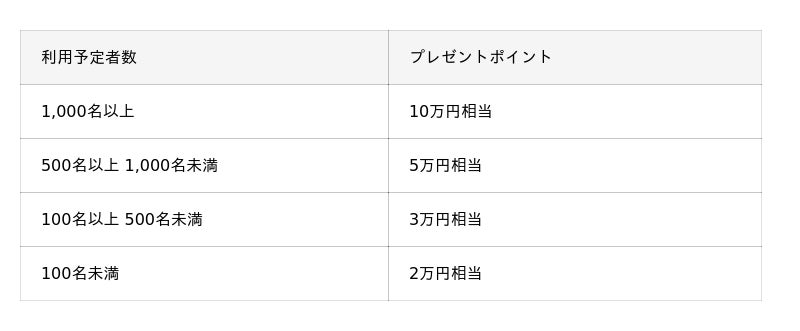 - ポイント取得方法:お申し込み後、当社サポート窓口よりメールにてギフトコードを送付いたします。法人管理画面にてギフトコードを登録することでポイントを取得できます