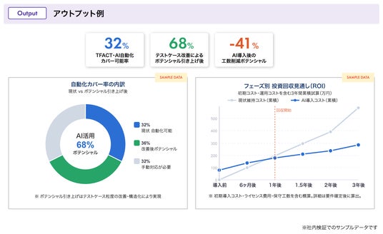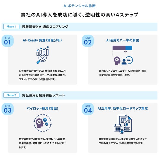 システムの特性やQAプロセスの違いにより、TFACT導入で「得られる効果の予測」は異なります。社内説明や導入判断の精度を高めたいお客様向けに、「AIポテンシャル診断サービス」をご用意しています。現状で「AIがどこまで活用可能か」の上限値を可視化し、「伸びしろ」をレポートにまとめてご提出いたします。