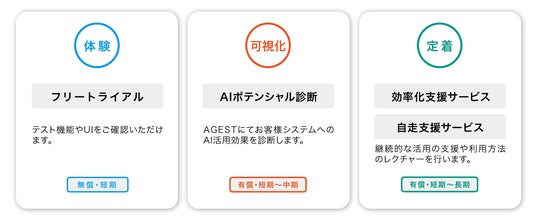 AGESTでは、これらの課題を解決するソリューションとして、企業の規模や業種を問わず、高度なAIテスト環境をご利用いただける「TFACT」SaaS版を提供しております。そして、この「TFACT」を導入いただくための前段階として、お客様のシステムにAIを導入するにあたってどの程度の効果を発揮するのかを検証する「AIポテンシャル診断サービス」および診断で見えたポテンシャルを現場で最大限に引き出す「効率化支援サービス」を新たに開始することで、AI導入の意思決定から運用定着までを強力に支援します。