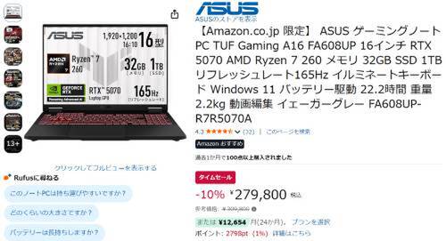 ASUSのゲーミングノートPC「ASUS TUF Gaming A16 FA608UP(FA608UP-R7R5070A)」がAmazonでタイムセール対象。参考価格309,800円のところ、10%オフの279,800円で販売中。