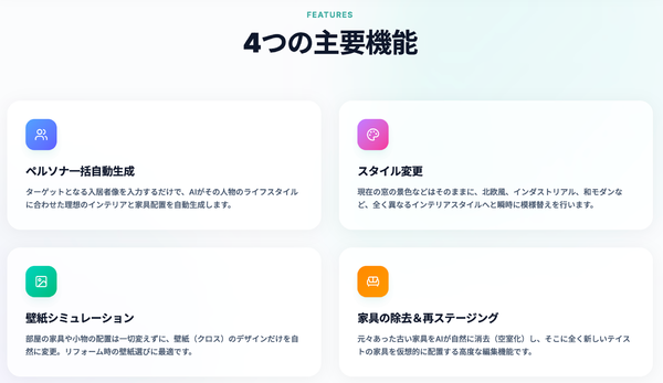 従来のバーチャルステージングと異なり、ペルソナ設定から空間デザインまでを一括で自動生成できる点が特徴とのこと。不動産仲介事業者をはじめ、リノベーション会社や管理会社、物件オーナーなど幅広い場面での活用が可能だとしている。